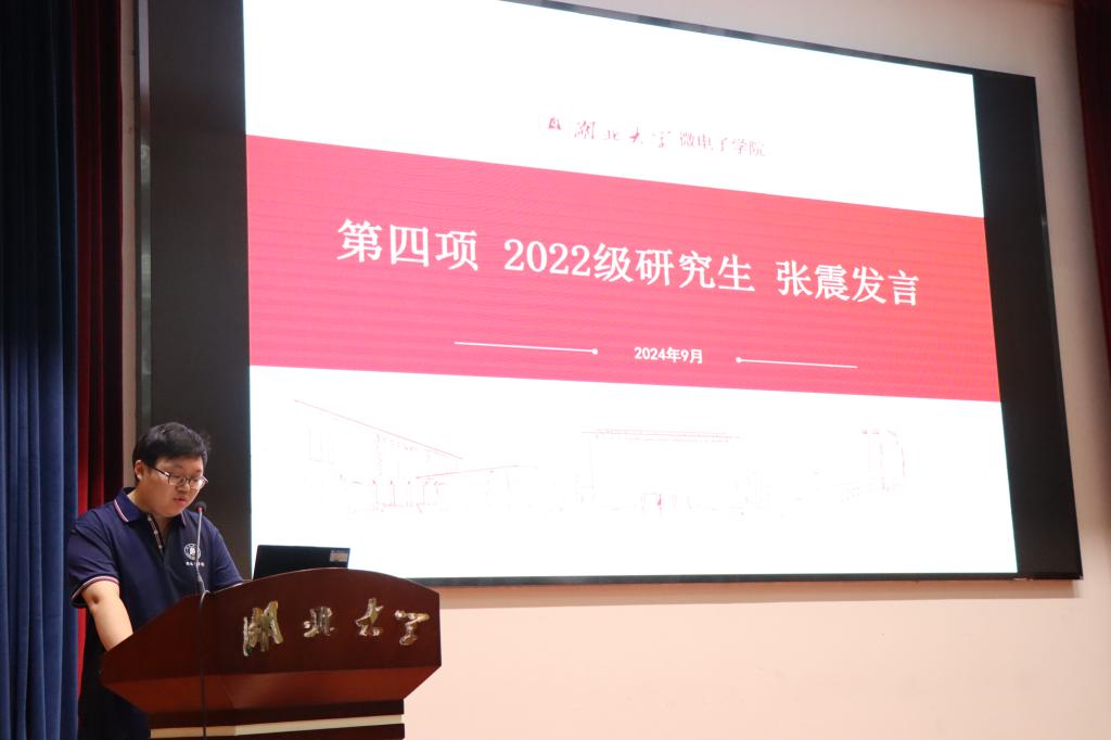 会中,在校研究生代表2022级硕士生张震同学分享他在湖大读研的心得体会。“于广袤原野,植各色繁花”,他用自身经历生动展示了研究生阶段可以如何有丰富的体验,学术研究上如何取得显著的成绩。他鼓励同学们充分借助公司多元发展、博采众长的广阔平台,用持之以恒向目前奋进的积极态度,勤耕不辍、绚丽绽放,为研究生阶段绘就纷繁色彩,让花海开遍人生的广袤原野。