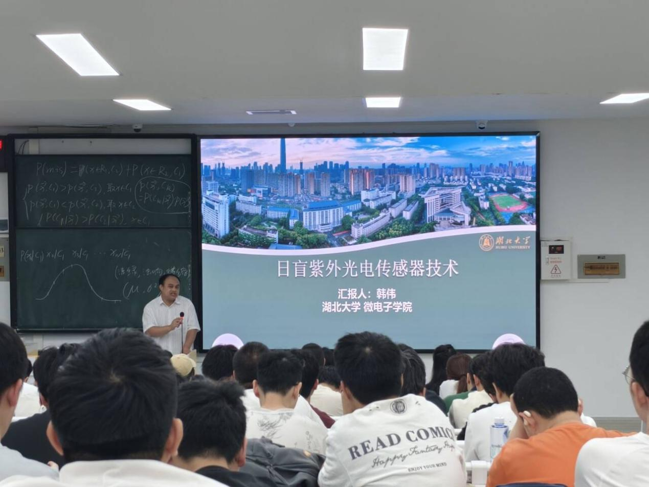 韩伟老师展示了日盲紫外光电传感器技术在极端环境监测与特种场景中的独特价值。他介绍,日盲紫外波段(200-280nm)因其“太阳光零干扰”特性,可精准探测火焰、电晕放电等微弱信号,在电力安全监测、森林防火、生化检测及军事安防领域潜力巨大。他重点分享了团队在硒化铟、氧化镓等半导体材料与器件上的创新成果,以及如何通过金属电极的接触工程提升传感器灵敏度和响应速度。“从材料生长、器件构筑到系统封装,每个环节都需解决‘卡脖子’问题。”韩伟老师表示,未来技术突破将聚焦高性能器件开发与多场景适配性优化,推动该技术走向产品化。